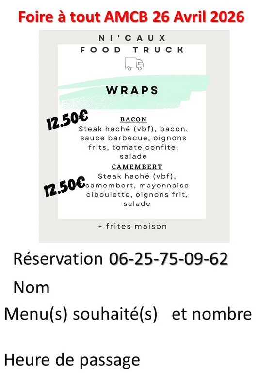 N'hésitez pas à réserver vos wraps au 06-25-75-09-62 ou nicauxft@gmail.com. Un espace de restauration sera à disposition.